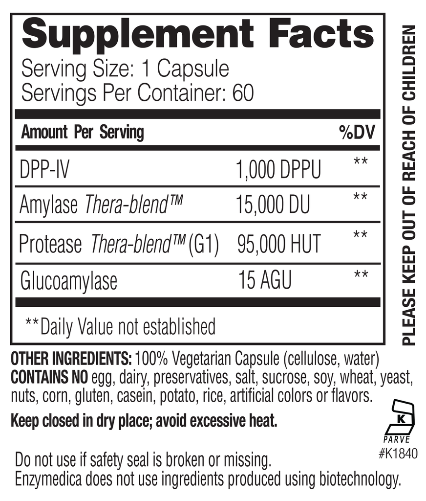 GlutenEase™ contains Protease Thera-blend™ (G1) along with DPP-IV activity for enhanced digestion of foods containing gluten and casein. † Starch-digesting amylase enzymes assist in the digestion of the carbohydrate portion of grains, such as wheat, which contain gluten.