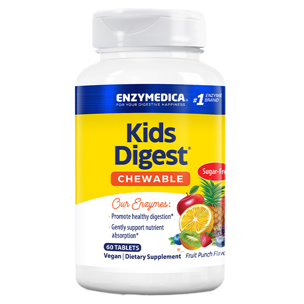 Kids Digest contains amylase, lipase, cellulase and protease Thera-blend™ enzymes, for breaking down carbohydrates, fats, fiber and protein, respectively.
